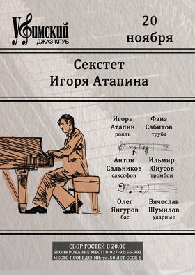 Четверг 20 ноября цена: 1500,00 р. Состав: Игорь Атапин (рояль) Фаиз Сабитов (труба) Антон Сальников (саксофон) Ильмир Юнусов (тромбон) Олег Янгуров (бас) Вячеслав Шумилов (ударные)